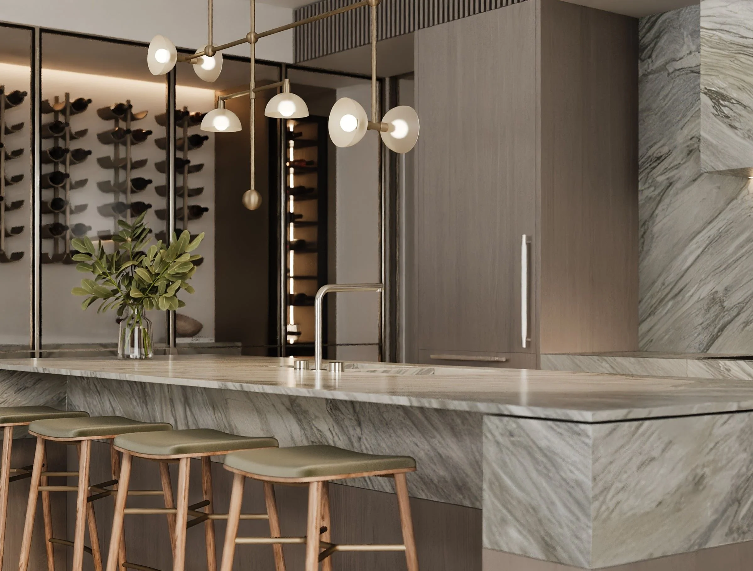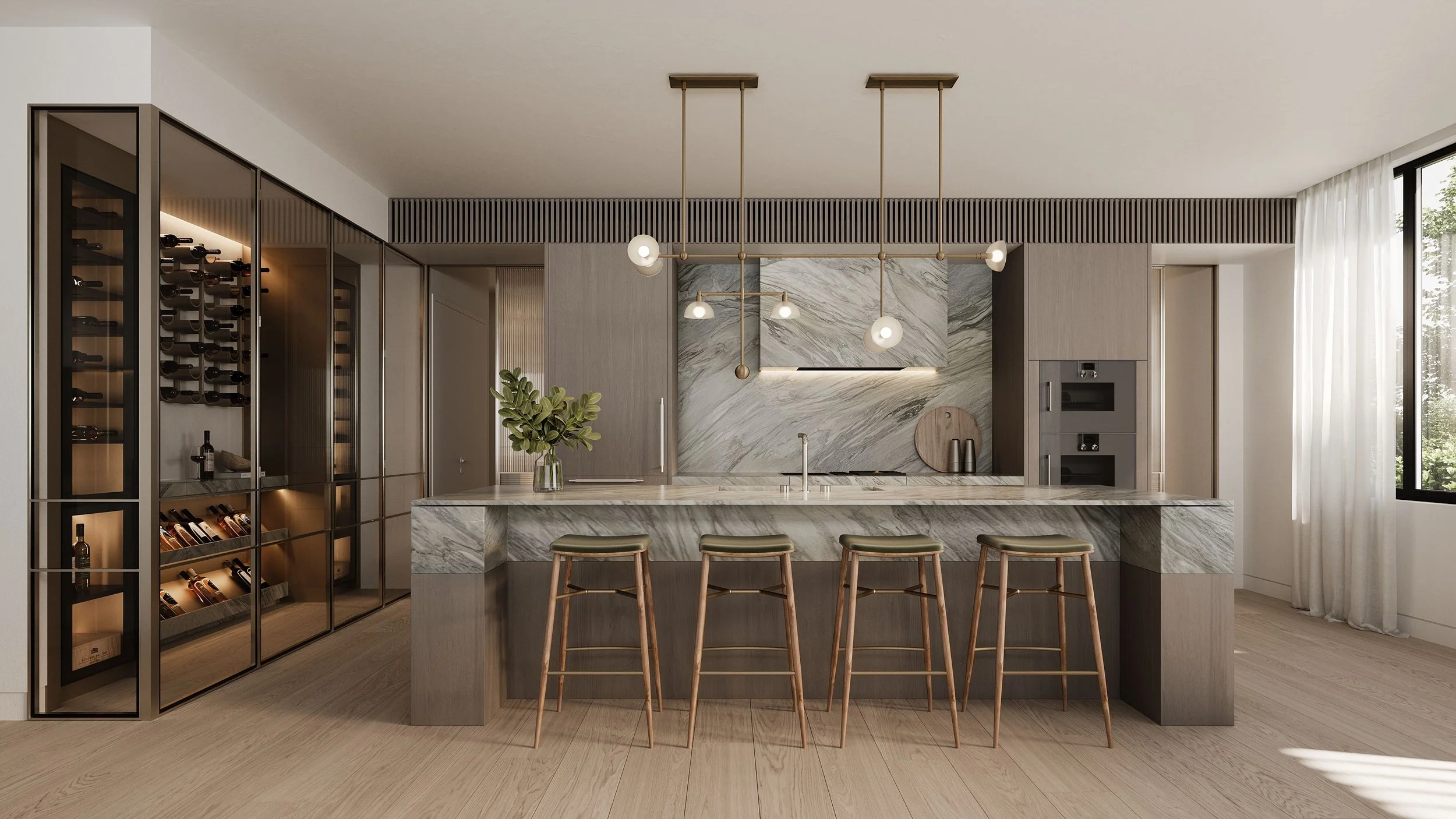 Elevate the Art of Entertaining in a culinary sanctuary where dramatic marble, curated wine storage, and considered design create a setting of effortless sophistication.