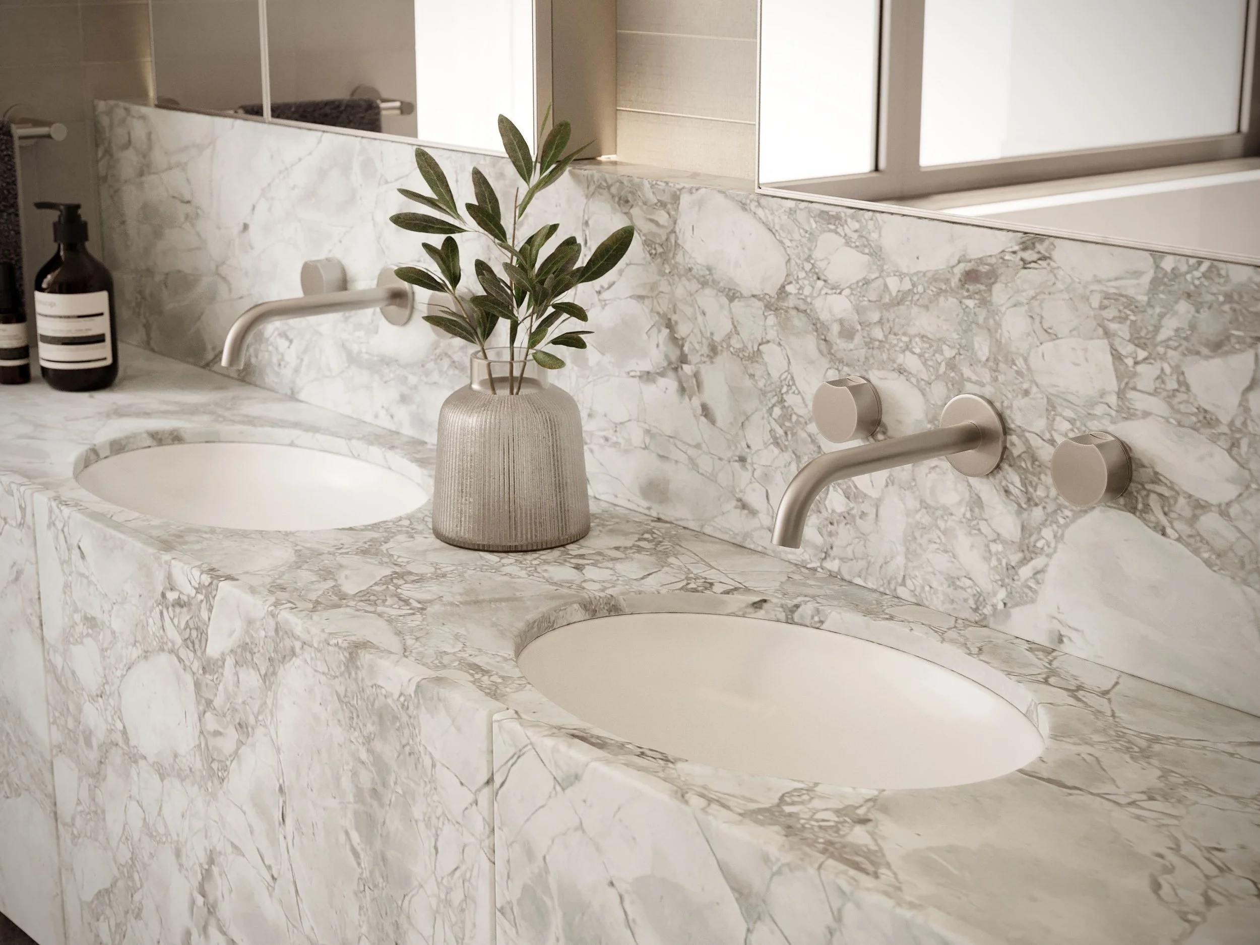 The master ensuite in the penthouse is a statement in refined elegance. The cool grey tones capture and reflect the daylight pouring through the large windows, beneath which sits a freestanding bath. The vast shower recess features an oversized rainfall showerhead which, along with the Calacatta marble and discrete cabinetry, creating a sancturay that is a nod to contemporary bathroom design.